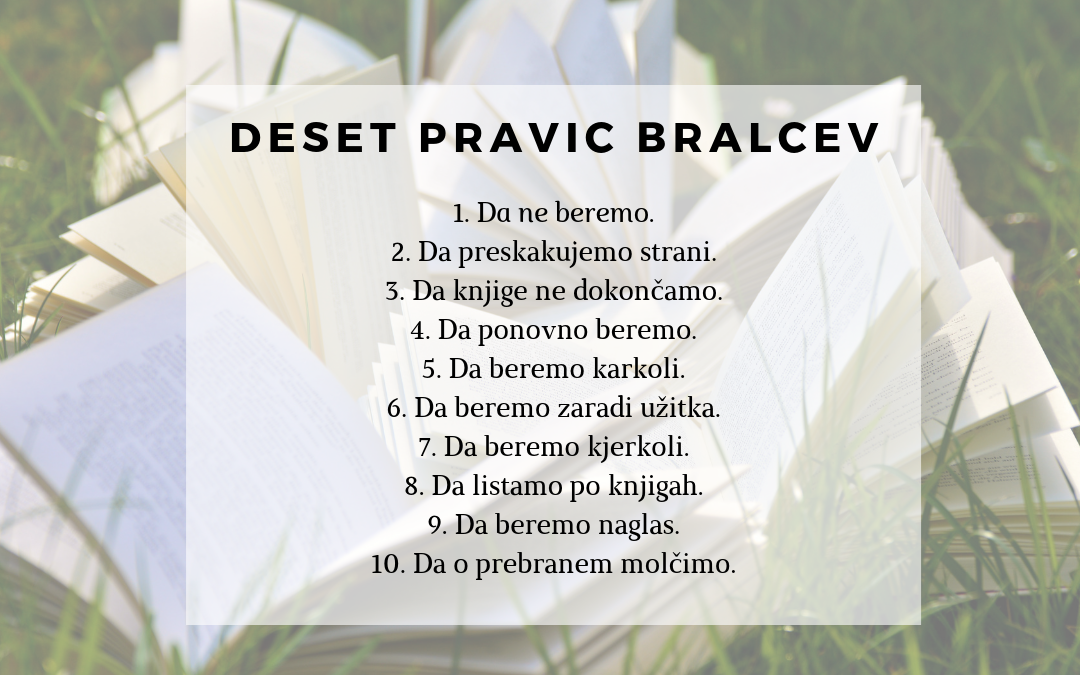 Toda kaj izbrati, kaj prebrati? Preden se odločimo, je dobro poznati Deset pravil bralcev Daniela Pennaca. Sama bi dodala še eno: da preberemo najprej konec zgodbe.