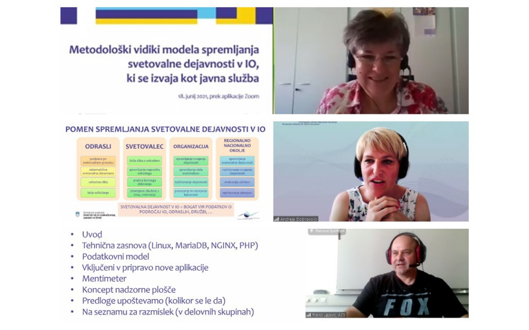 We strived to include all stakeholders in the preparation of the model for monitoring. Therefore, we organised two expert consultations, which policymakers in the field of ALE and guidance in ALE attended as well as experts working in various types of guidance in Slovenia, directors and counsellors of ALE organisation, who carry out public service following the Adult Education Act, other interested ALE professionals and SIAE employees.