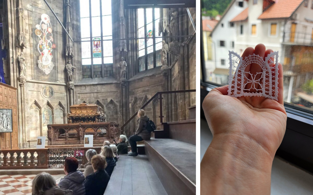 The project activities included group mobility for adult learners. Members of the experimental lace-making group from the Idrija Lace School collaborated with their peers in Austria. In St Stephen’s Cathedral, located in the heart of Vienna, the Korona vrtnica (Corona Rose) by Eva Petrič is on display, with a significant portion of the lacework contributed by mobility participants.