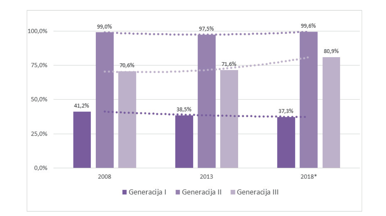 The core of the circles is the middle generation, which is accompanied by younger and older generations. The proportion of circles involving third-age individuals is slowly increasing. The period 2008–2018, includes some circles, which only involve young people. The proportion of circles, in which all three generations are involved, has increased.