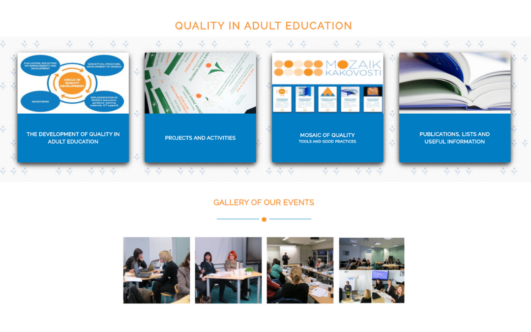 Support for the development of the quality of adult education, especially of public adult education programmes, is a very important activity for SIAE. Among other fields of work on quality we introduce all activities and projects that we carry out at the SIAE on the internet. We have a special web page “Quality in Adult Education”. And we are very proud that since now the page is also available in English: https://kakovost.acs.si/en.