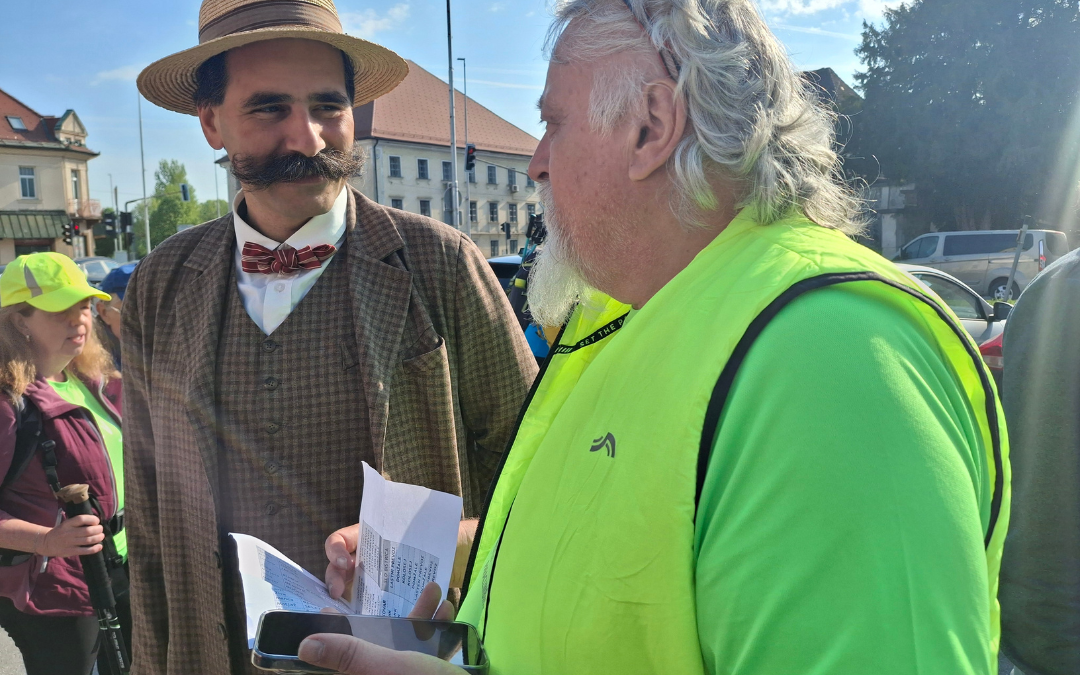 Na nasprotni strani ceste je spomenik. Odlični imitator našega pisatelja nam je slikovito opisal, zakaj je kipar Ivo Jurkovič upodobil Cankarja v sedečem položaju, in povedal zgodbo o slavnih mesarjevih kladah. Citate iz Cankarjevih del je dobesedno stresal iz rokava.