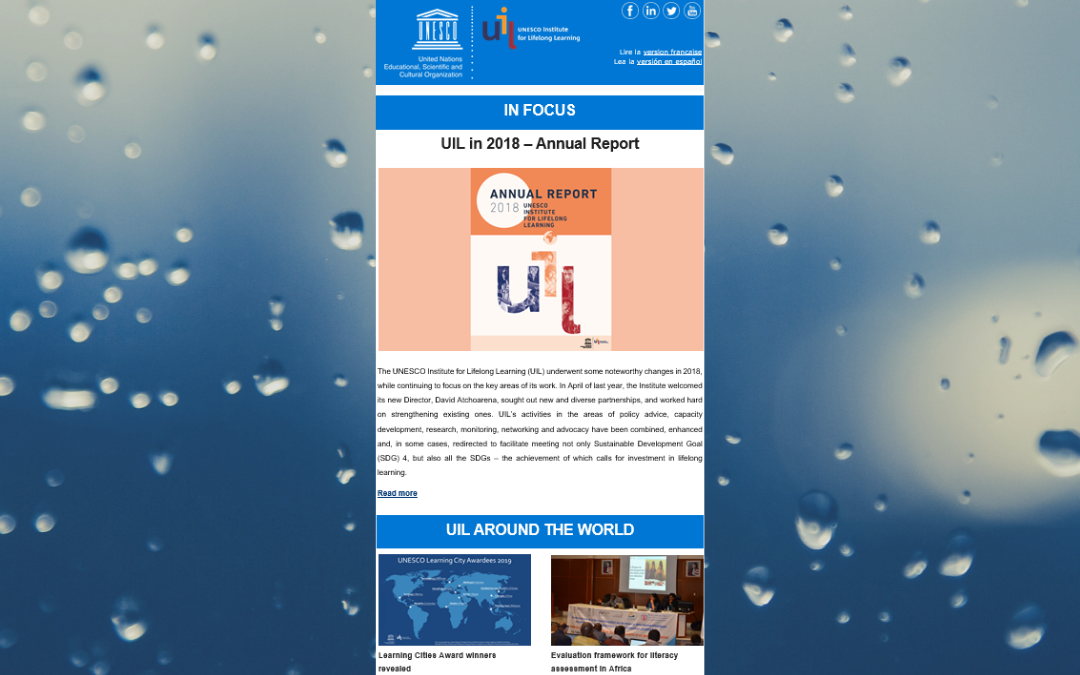 V ospredje postavljajo poročilo o delu v letu 2018. Predstavljajo deset učečih se mest, dobitnikov nagrad UNESCO. Pišejo o doseganju ranljivih skupin z digitalnimi rešitvami. Kako so v UIL obeležili letošnji 8. marec, dan žena? Preverite v glasilu. Preberite tudi objavljene spletne dnevnike in novice.