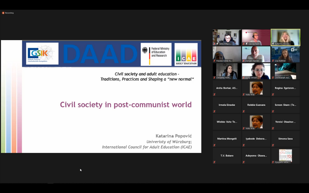 Mednarodna delavnica v organizaciji Univerze v Würzburgu in ICAE Civilna družba in izobraževanje odraslih – navade, prakse in oblikovanje ‘nove normalnosti’, ki je bila 28. maja, je imela za cilj preučiti vlogo civilne družbe v IO. Pobliže naj bi si ogledali različne kontekste, izzive in omejitve, ki jih trenutna kriza nalaga civilni družbi, ter njene možnosti, da sooblikuje ‘novo normalnost’ v navezavi na zaveze spoštovanja človekovih pravic ter načeli prava in pravičnosti. Tako so organizatorji zapisali v povabilu …