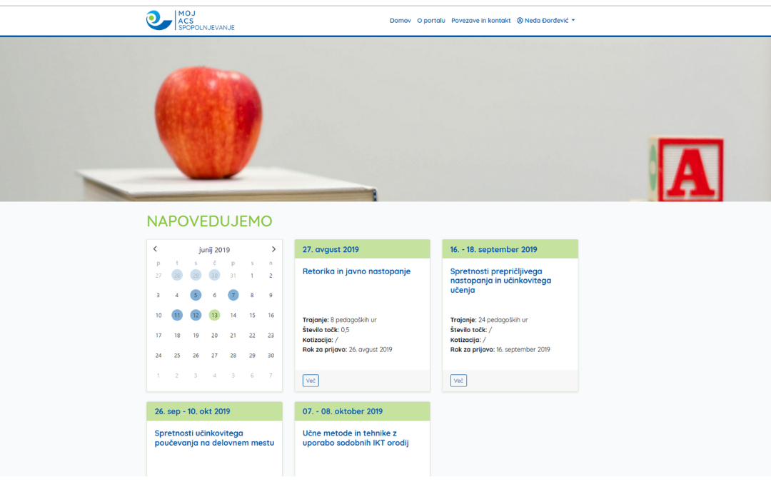 Želeli smo razviti portal, ki bo enostaven in bo zajemal obe področji: učni kotiček in e-prijavnico. Povezan je s spletno aplikacijo v podporo izobraževalni dejavnosti ACS. Zato organizatorji izobraževanj, ki so tudi administratorji portala, lahko z dvema klikoma prenesejo podatke o udeležencih. Za ažuriranje osebnih podatkov skrbijo udeleženci sami.