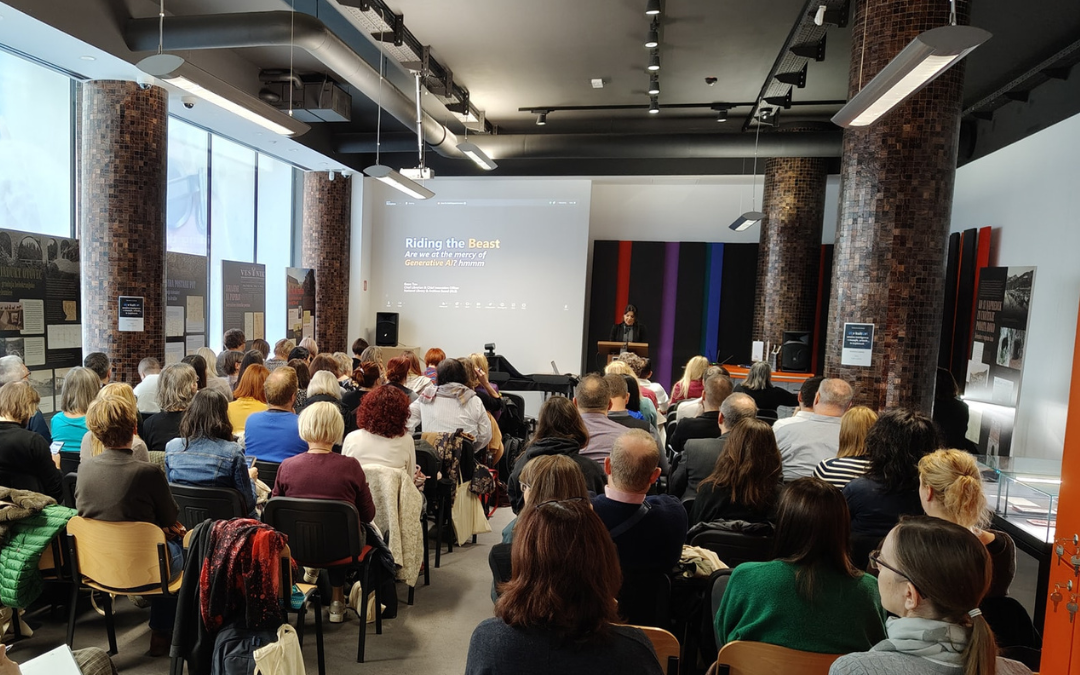 V drugem delu dogodka smo prisluhnili predstavnicam in predstavniku NUK, muzeja, arhiva in ZBDS. V vseh treh podobnih panogah so bile pripravljene ankete, ki odslikavajo stanje poznavanja, uporabe in zaupanja v UI. Izkazalo se je, da smo zaposleni v arhivih, knjižnicah in muzejih nezaupljivi do novih tehnologij, da se zavedamo njihovega pomena in smo se pripravljeni učiti. To je tisto, kar šteje, mar ne? Veselim se prispevka, ki bo nastal na podlagi teh raziskav.