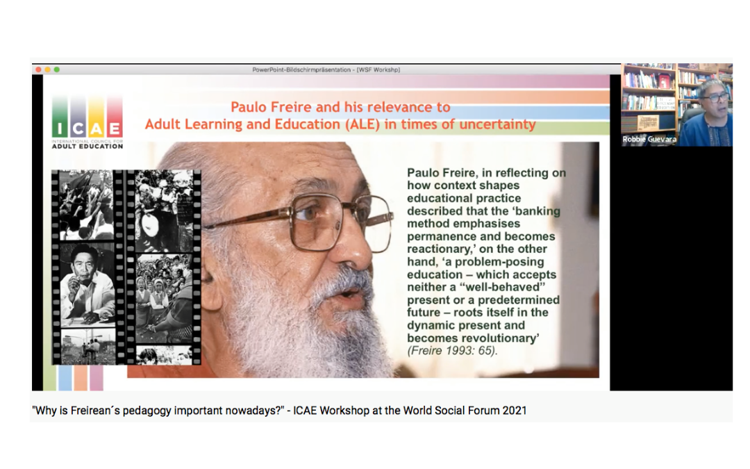 ICAE je v okviru virtualnega Svetovnega socialnega foruma 2021 (World Social Forum 2021) 26. januarja priredil dogodek v počastitev 100. obletnice rojstva brazilskega izobraževalca Paula Freireja, utemeljitelja kritične zavesti in dialoškega izobraževanja, ki pomembno določata tudi velik del slovenske andragoške misli.