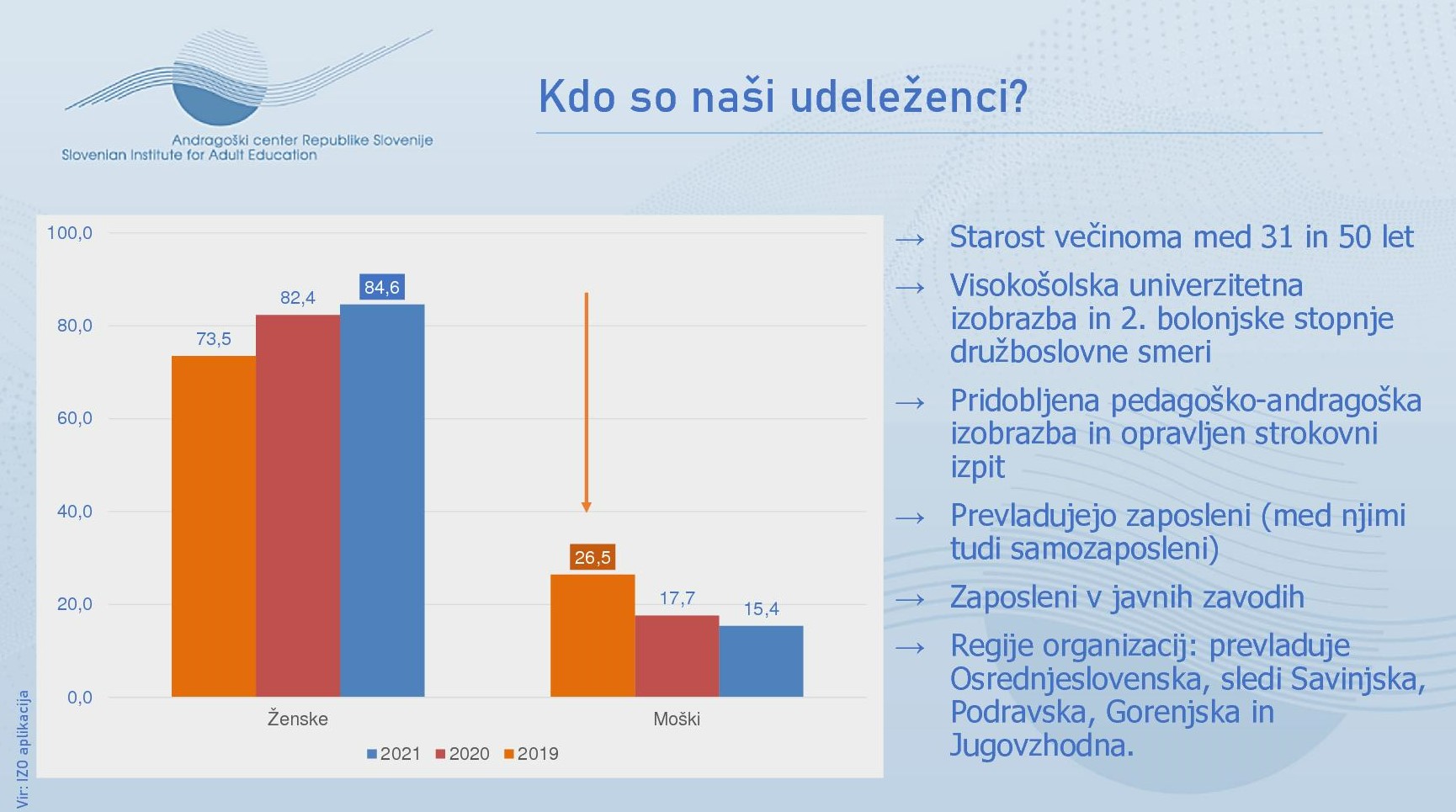 Delež udeleženk v naših izobraževalnih programih z leti narašča, v letu 2021 je bil celo najvišji (85 %). V primerjavi z deležem vključenih moških, ki z leti upada, pa je bil ta do sedaj najvišji (27 %) leta 2019 . To lahko pripišemo izvedbam izobraževanj na tržni dejavnosti, v okviru katere smo programe izvajali za podjetja, kjer so zaposleni večinoma moški (kot so Slovenske železnice, NEK, Gasilska zveza Slovenije, Policijska akademija, Institut za varilstvo).