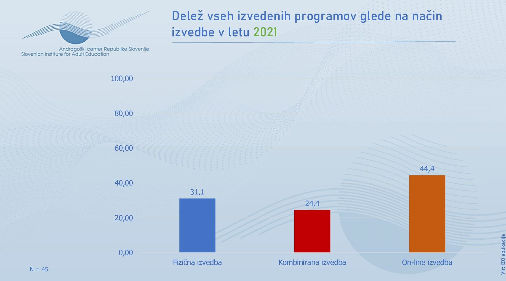 V analizi 2021 smo prvič predstavili tudi podatke o deležu programov po načinu izvedbe: fizična, kombinirana in online. Skoraj polovico vseh programov smo izpeljali na daljavo v obliki e-izobraževanja.