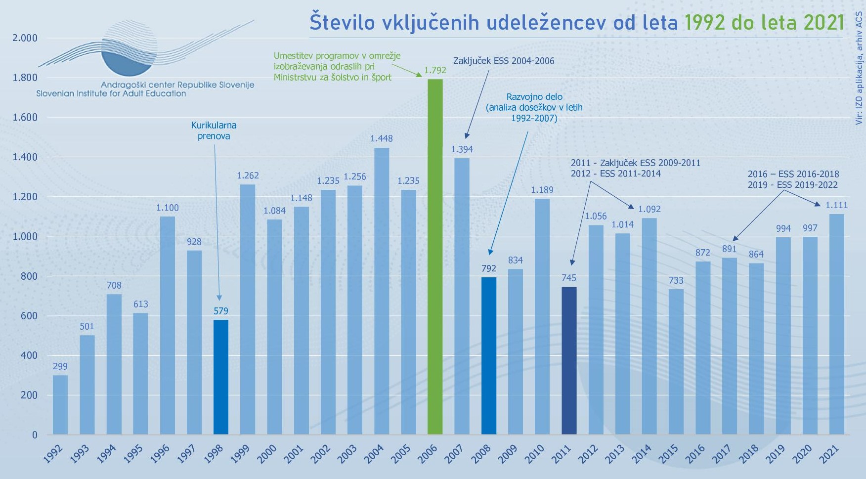 Od začetka delovanja ACS je število vključenih počasi naraščalo, nato pa v določenih obdobjih nekoliko upadlo (npr. ob kurikularni prenovi izobraževalnih programov in zaključkih projektov ESS). Največ izobraževalcev odraslih se je v programe andragoškega usposabljanja in spopolnjevanja vključilo v letu 2006, skoraj 1.800; takrat so bili programi umeščeni v Katalog stalnega strokovnega spopolnjevanja pri tedanjem MŠŠ, potekali so projekti Program 5.000 in Program 10.000 za brezposelne, številne programe so izpeljali večkrat. V letu 2020 je prišlo do minimalnega porasta števila vključenih zaradi omejitev oz. zapiranja družbe zaradi pandemije covida-19. Takrat smo nekatera izobraževanja odpovedali, nekatera pa prestavili na drugo polovico leta. Ta čas smo izkoristili predvsem za to, da smo se sami usposobili za izvajanje in podporo izobraževanju na daljavo (Zoom, MS Teams, spletne učilnice in druga spletna orodja).