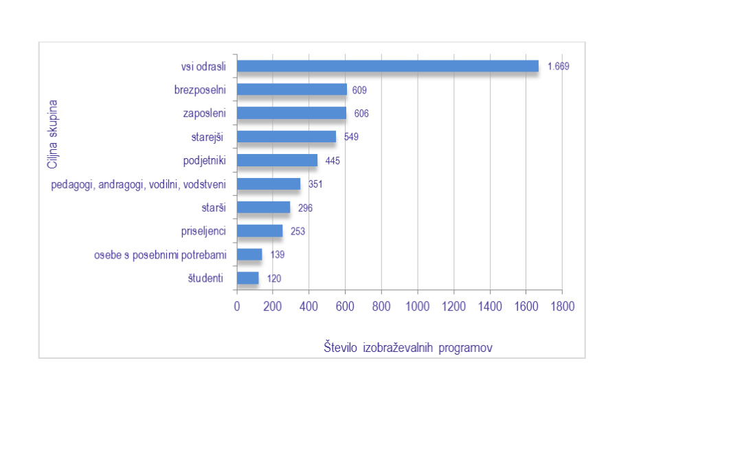 Dve tretjini celotne izobraževalne ponudbe so predstavljali programi neformalnega izobraževanja in usposabljanja. V največji meri so to programi učenja tujih jezikov. Tretjina ponudbe je bila namenjena pridobitvi višje stopnje formalne izobrazbe. V tej ponudbi je bilo največ programov srednjega strokovnega izobraževanja ter srednjega poklicnega izobraževanja odraslih.