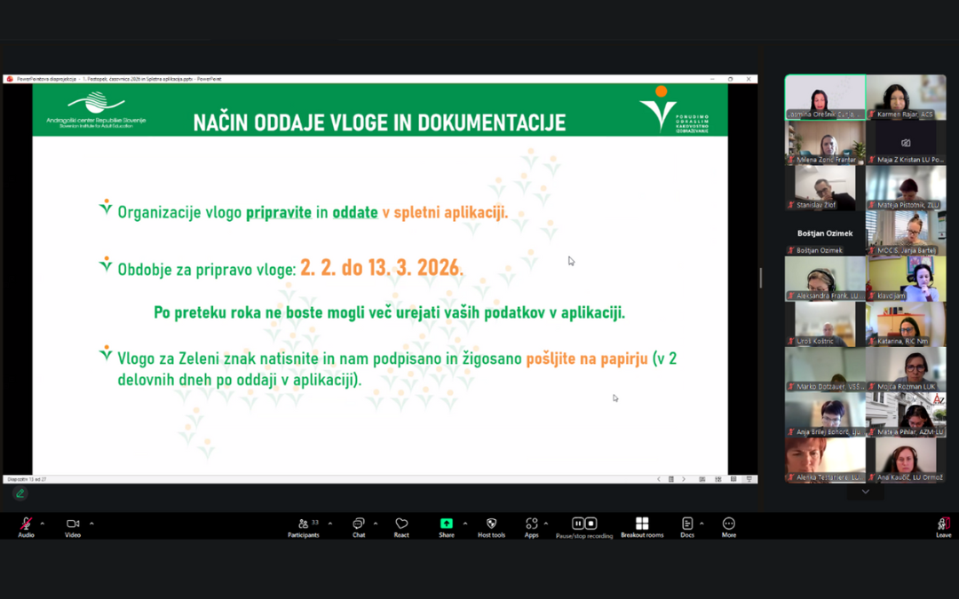 Pripravljalnega srečanja pred postopkom za pridobitev oziroma podaljšanje pravice do uporabe zelenega znaka kakovosti (ZZK) v letu 2026 se je udeležilo 30 predstavnikov organizacij za izobraževanje odraslih. Srečali smo se na daljavo 10. decembra 2025. Nekatere organizacije znak po treh letih obnavljajo, druge pa se v postopek vključujejo ponovno ali prvič. Cilj srečanja je bil posredovati konkretne usmeritve za kakovostno pripravo vlog za znak.