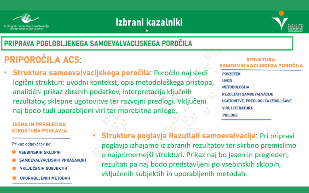 Zaključni vsebinski sklop sva oblikovali s sodelavko Mileno Zorić Frantar. Predstavili sva strokovna priporočila za izvajalce, pripravljena na podlagi izkušenj Komisije ACS za presojo vlog za ZZK. Posebej sva izpostavili tista merila, pri katerih se v postopkih presoje najpogosteje pojavljajo vprašanja ali dileme. Poudarili sva tudi pomen uporabe povratnih informacij in preteklih komentarjev komisije kot dodatnega orodja za dolgoročni razvoj notranjih sistemov kakovosti v organizacijah.