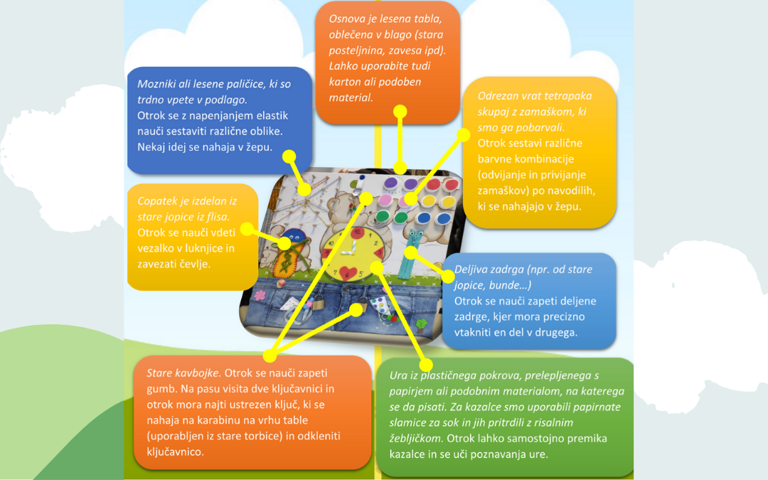 Didaktično igračo so udeleženke izdelale iz materialov, ki bi jih sicer zavrgli: zamaškov, lesa, kartona, starega blaga (majic, hlač, zaves, posteljnine …), zadrg ipd. Dida spodbuja logično mišljenje otrok, finomotoriko in koordinacijo.