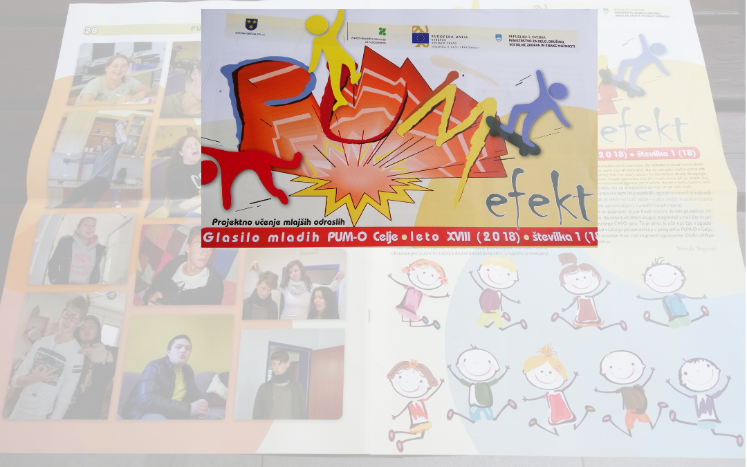 V PUM-O Celje so ob 18-letnici programa izdali tiskano glasilo z naslovom PUM-O efekt. Publikacija je posebna že zato, ker je natisnjena in smo jo dobili v poštni nabiralnik ACS. Prinaša utrinke pumovskega vsakdana in življenja vključenih. V rubriki Kronika je kratek opis dogodkov po mesecih. Direktor se v svoji dobrodošlici sprehodi skozi zgodovino delovanja programa PUM oz. PUM-O v Celju in ga na kratko predstavi. Vsa ostala besedila, fotografije, risbe, utrinki in razmišljanja so delo mentorjev in udeležencev. Kaj delajo? Spoznavajo naravo, skrbijo za svoj prostor, rišejo in slikajo, pišejo pesmi, potujejo, sprejemajo goste (iz tujine), spoznavajo različna dela, se učijo, povezujejo z delodajalci … Udeležujejo se medpumovskih športnih iger, tekmujejo v družabnih igrah, spoznavajo družbo in njeno delovanje in … sanjarijo. Kot vsi mladi. Zapis prostovoljke, ki dela z njimi, nas opomni, kako lahko razumemo poti, po katerih hodimo, in medsebojne razlike.
