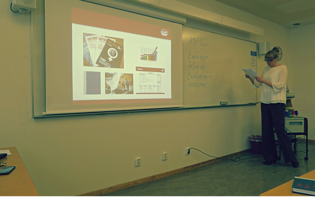 Program delavnice je bil bogat. Najprej smo obiskali Zavod za zaposlovanje, in sicer njegovo posebno enoto, ki se edina v državi ukvarja samo s priseljenci, kjer smo se seznanili z novo ureditvijo na področju zaposlovanja priseljencev ter uvodnim programom za novo prispele priseljence. Obiskali smo tudi šolo ABF Vux, ki združuje politehnično fakulteto, visokošolsko izobraževanje odraslih, srednješolsko in osnovnošolsko izobraževanje ter poklicno usposabljanje in program švedskega jezika za priseljence na različnih stopnjah. Šola, ki obstaja že več kot 100 let, deluje kot podjetje, kjer imajo pomembno vlogo delničarji, vendar dobička ne izplačujejo lastnikom, temveč ga porabijo za nadaljnji razvoj. Predstavili so nam sistem presojanja in razvijanja kakovosti v programu Švedščina za priseljence in tudi spremenjen koncept poučevanja oz. ocenjevanja na delavnicah v okviru programa Švedščina za priseljence – prej ni bilo negativnih ocen, tudi ponavljati ni bilo možno. S spremembami se zdaj soočajo tako, da sproti spremljajo zadovoljstvo udeležencev, in sicer z njimi spomladi opravijo pogovor in nato še ob koncu semestra, da ugotovijo, kako spremembe vplivajo nanje.