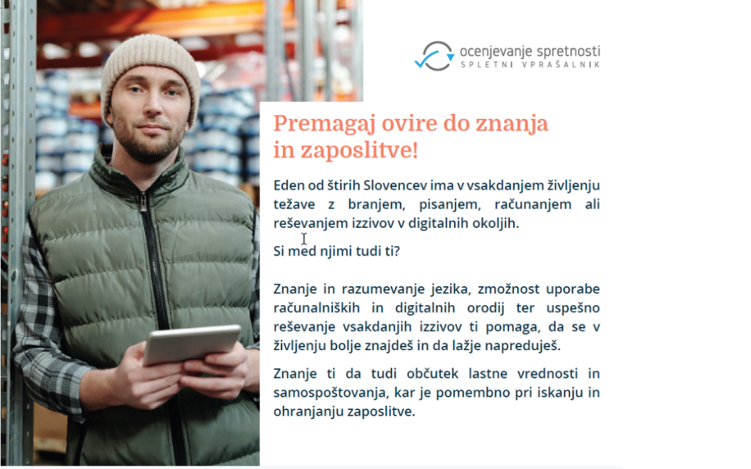 Spletni vprašalnik SVOS je še vedno edini standardizirani inštrument za individualno merjenje oziroma ocenjevanje (testiranje) spretnosti odraslih na treh področjih tako pri delu kot izven tega: matematične spretnosti s pomočjo nalog za razumevanje in uporabo matematičnih informacij, podatkov in prikazov v konkretnih situacijah; besedilne spretnosti z uporabo nalog za branje, razumevanje in uporabo informacij iz tiskanih ali digitalnih besedil; reševanje problemov v tehnološko bogatih okoljih z reševanjem nalog za poznavanje in uporabo digitalnih tehnologij za reševanje problemov. Vprašalnik obsega tudi izbirne module za samoocenjevanje zdravja, poklicnih interesov in obsega uporabe spretnosti.