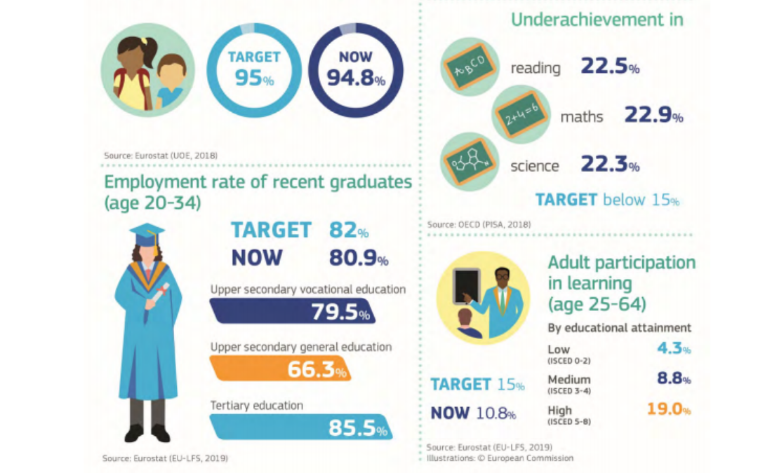 Komisija v Pregledu ugotavlja, da zastavljeni cilj ne bo dosežen. Stopnja udeležbe odraslih v VŽU v EU je v letu 2019 znašala 10,8 %, kar je do sedaj najvišja vrednost, vendar daleč pod zastavljenim ciljem. Najvišjo stopnjo udeležbe so beležile skandinavske države – na Švedskem je znašala 34,3 %, Finskem 29 %, Danskem 25,3 %. Najnižjo udeležbo pa so imeli v Romuniji 1,3 %, Bolgariji 2 %, Hrvaški 3,5 % in Slovaški 3,6 %. V desetletnem obdobju (2009–2018) so največji napredek oziroma porast dosegle Francija za 13,8 odstotnih točk, Švedska za 11,8 in Estonija za 9,7 odstotnih točk.