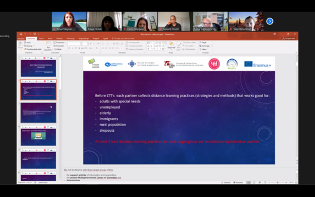 Torej je projekt v današnji situaciji kot naročen. S kolegi si bomo lahko izmenjali primere dobrih praks, da bodo predavanja še boljša. Čeprav ne moremo potovati, smo se s partnerji 28. 1. 2021 dobili na začetnem sestanku na daljavo, kjer smo se predstavili drug drugemu ter uskladili prve korake. Dogovorili smo se, da bo vsak izmed partnerjev zbral in popisal strategije in metode za eno od ciljnih skupin. Končni izdelek bo e-priročnik za učitelje, kjer bodo opisane najučinkovitejše metode učenja na daljavo.