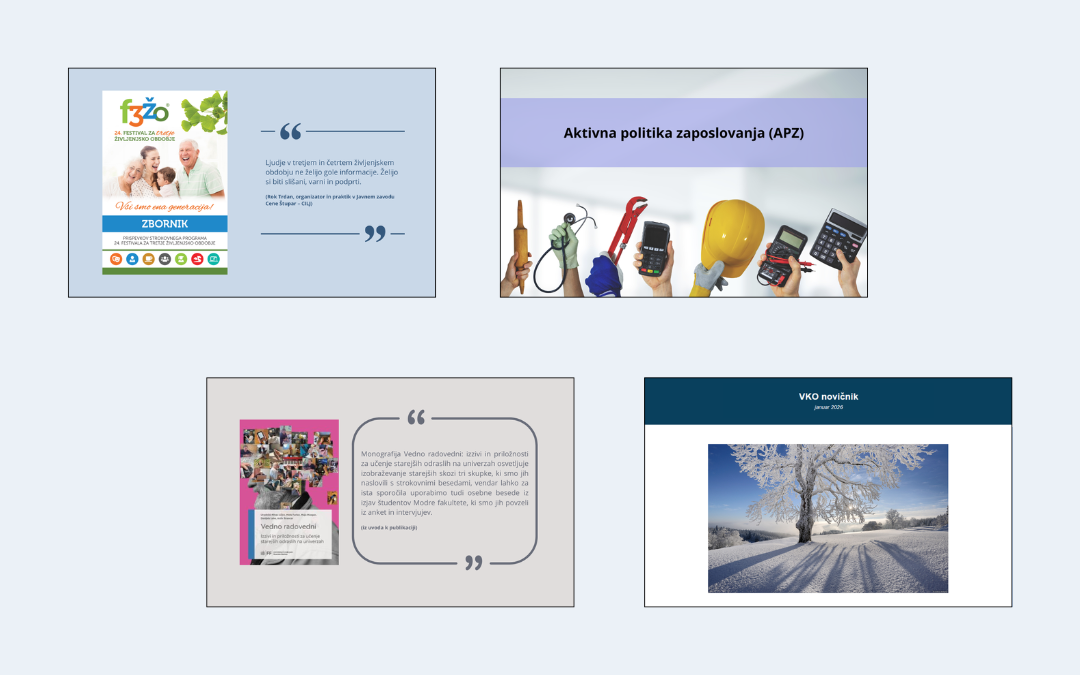 V Cankarjevem domu v Ljubljani je bil med 30. septembrom in 2. oktobrom 2025 24. Festival za tretje življenjsko obdobje. Dogodek vsako leto odpira vprašanja kakovostnega staranja, socialne vključenosti, medgeneracijskega sodelovanja, izobraževanja in sožitja družbenih skupin v tretjem in četrtem življenjskem obdobju. V strokovnem programu so pripravili 10 okroglih miz. Povzetke razprav so predstavili v zborniku, ki je izšel pred nekaj dnevi. Več >>