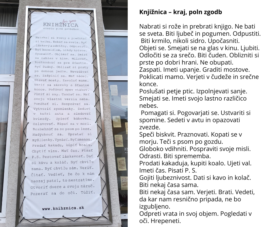 Kraji, polni zgodb. Tako na Slovaškem imenujejo knjižnice. Zapis na pročelju ene od njih nas je presenetil na prvem sprehodu po Bratislavi. Predstavitev Davida Baranka iz Slovaškega centra za znanstvene in tehnične informacije na konferenci pa je pokazala, da so njihove knjižnice tudi odprt prostor za krepitev najrazličnejših spretnosti vseh.
